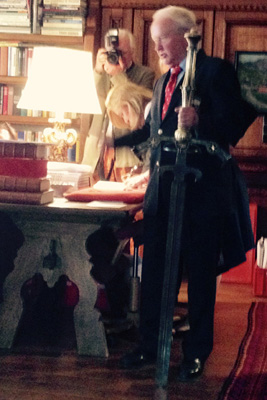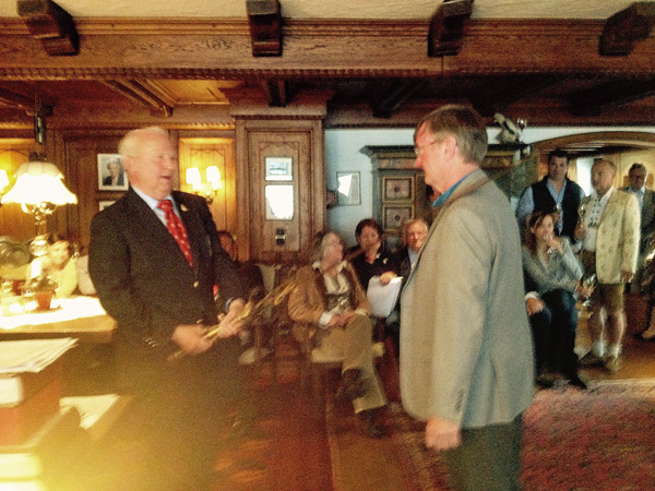 With these words new Sisters and Brothers are admitted to the Brotherhood by means of the sword dubbing. The admission ritual is one of the most important traditions of the Brotherhood. Brotherhood Master Adi Werner dubs new members with a 15.5 kg heavy sword from the 14th century, either in the private apartments of the Werner Family or in the Hospiz chapel, watched by member Brothers and Sisters. The new Brothers and Sisters may henceforth wear the emblem pin on their lapel.